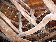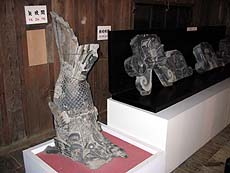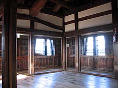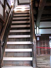 【↑天守閣内部 (左)天井 (中左)保存されている鯱 (右)階段はかなり急】