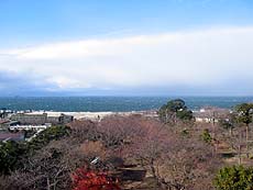 【↑(中左)最上階 (中右)最上階より琵琶湖を望む (右)彦根市街中心部を望む】