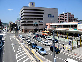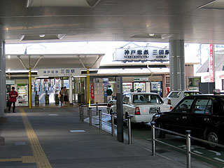 初めて降りた三田駅。駅前周辺は閑散としていて、ホントに今日は5月3日なのか? と思ってしまうほど。駅前のバスターミナルも人気がなく…。先ほどの大渋滞といい、福知山線不通の影響からクルマ利用が増えているんでそか。